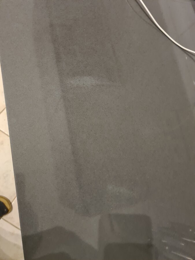 Bei dem Versuch Klebstoffreste der Montage zu entfernen habe ich idiotischerweise mit einem Schwamm, der mit staken, organischen Lösungsmittel getränkt war, gearbeitet. Das Resultat sind helle Flecken in der dunklen Quarzarbeitsplatte, da ich wahrscheinlich die Pigmente dabei extrahiert habe.