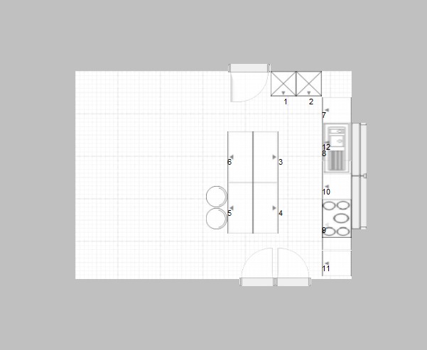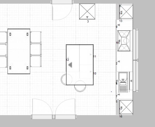 Hier mal Deine Planung allerdings etwas der Realität angepasst (Passleisten, höhe Kühli, Position Türen, Durchgang zum Wohnen, Abstand zwischen den Zeilen)