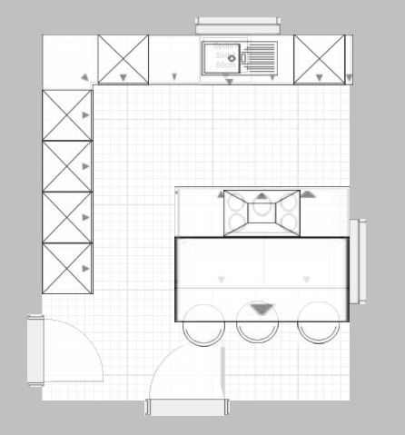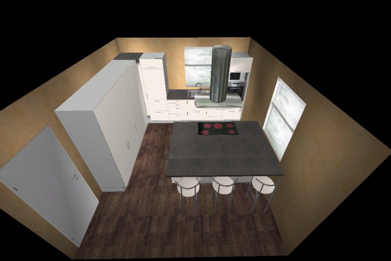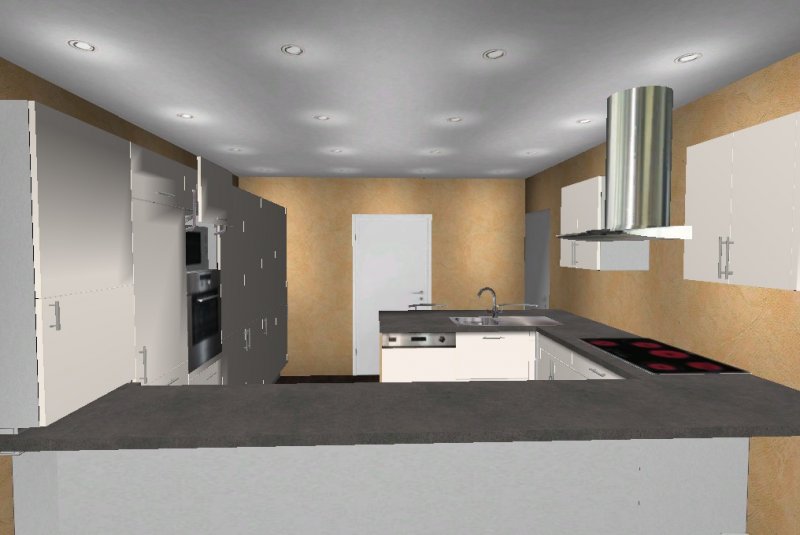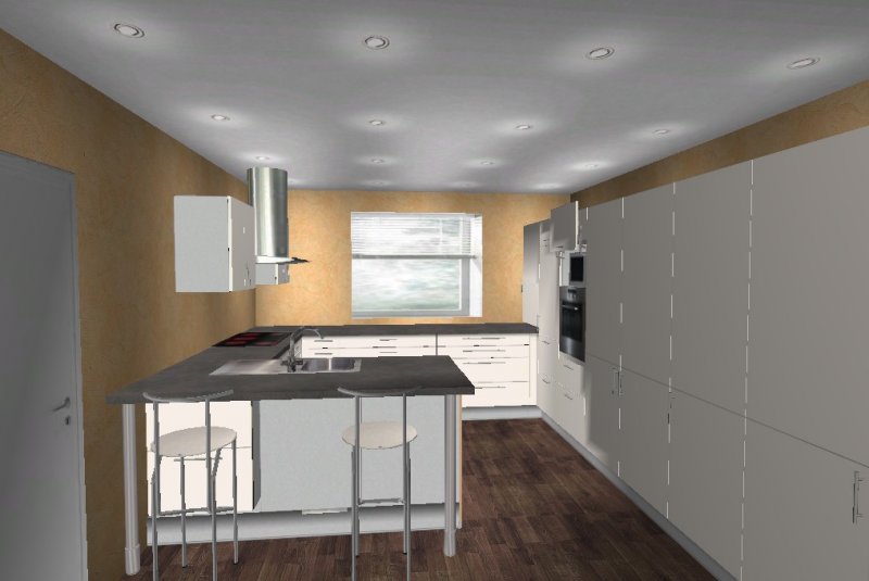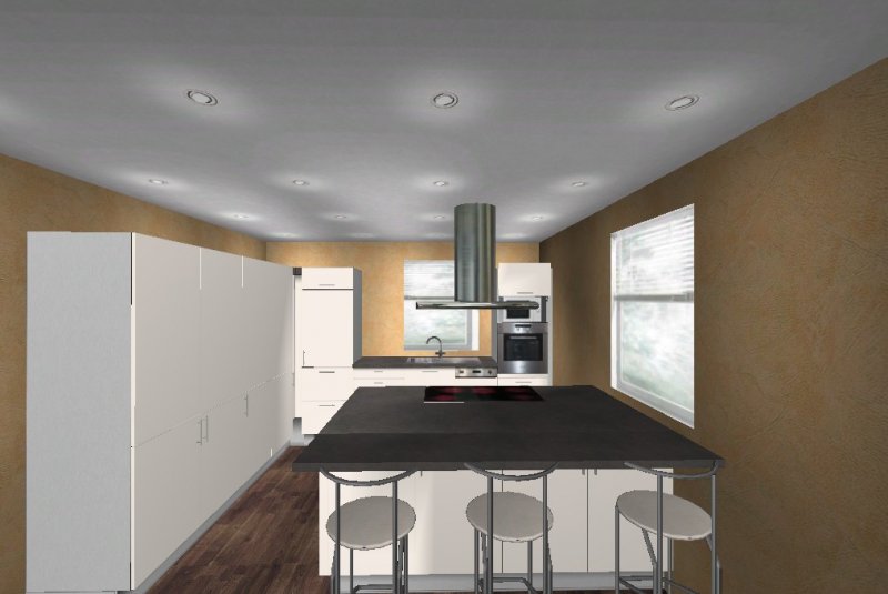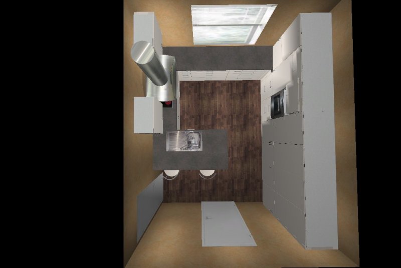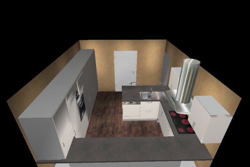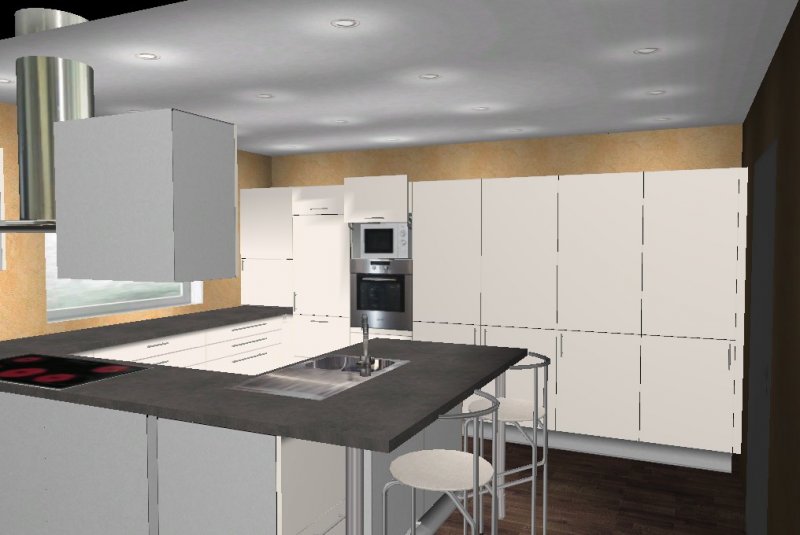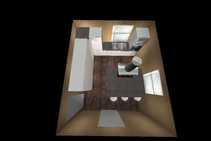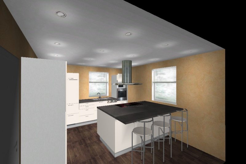 Die Insel kommt uns etwas knapp vor, möchten aber dennoch eine Variante mit Insel versuchen, aber nicht mittig im Raum sondern an der Wand vor dem rechten Fenster (müssen wir aber noch basteln damit ich es hier mal reinstellen kann)
