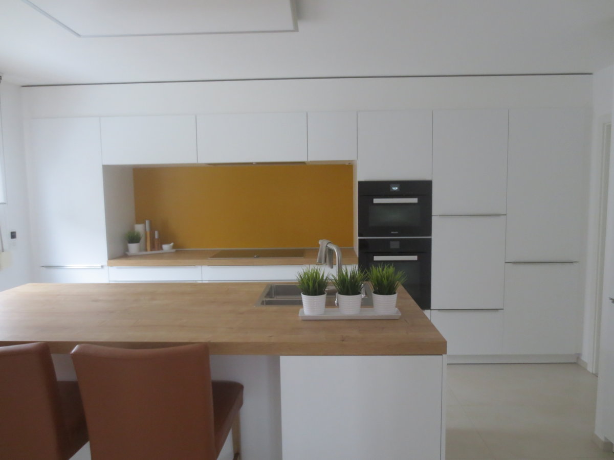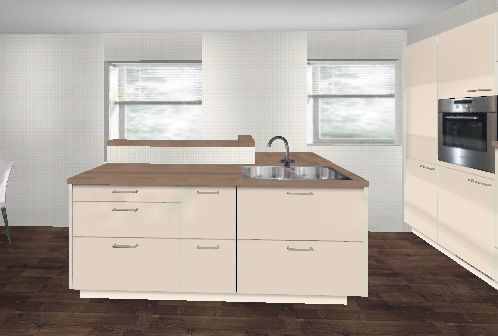 Vorteil wäre halt, man könnte rechts und links der Spüle vorbereiten, steht über Eck und ist recht kommunikativ. Auch der Alleinkoch hat kleine Wege in der Küche. Und, es sind alle Annehmlichkeiten wie erhöhter Backofen , erhöhte GSP, MUPL , DAH kopffrei usw. verwirklicht.