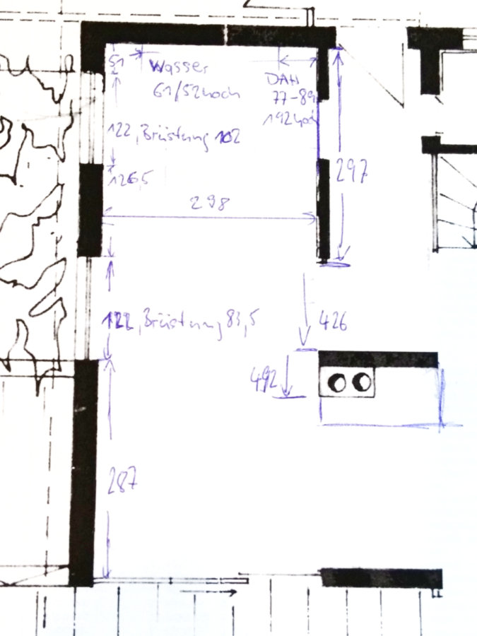 Ich habe im Grundriss mal den Punkt blau markiert, wo in etwa für die Spüle das Wasser aus dem Boden kommen müsste, damit du @andi.manuel das mal prüfen kannst.