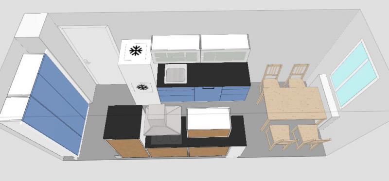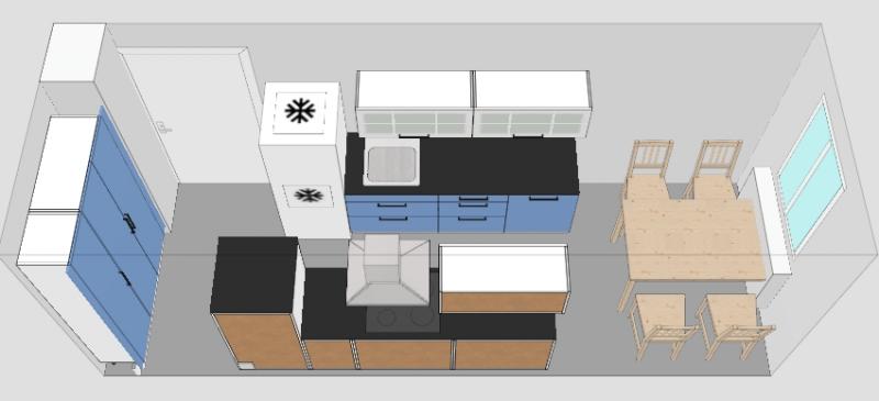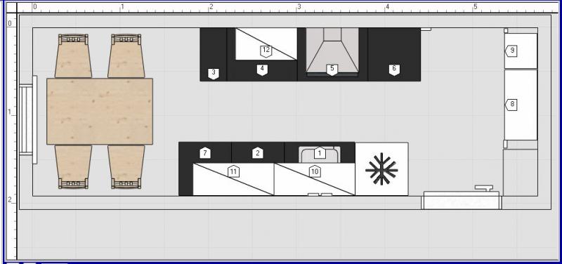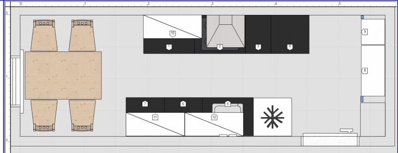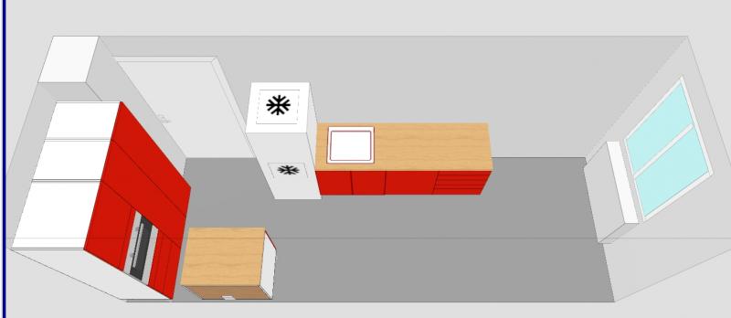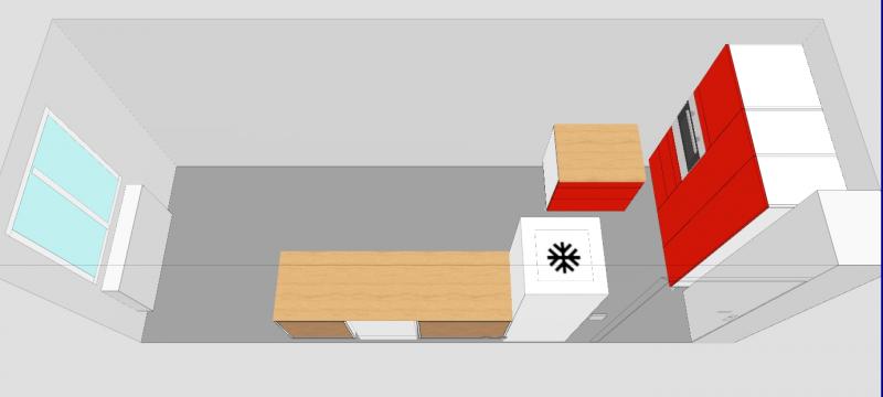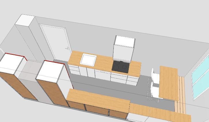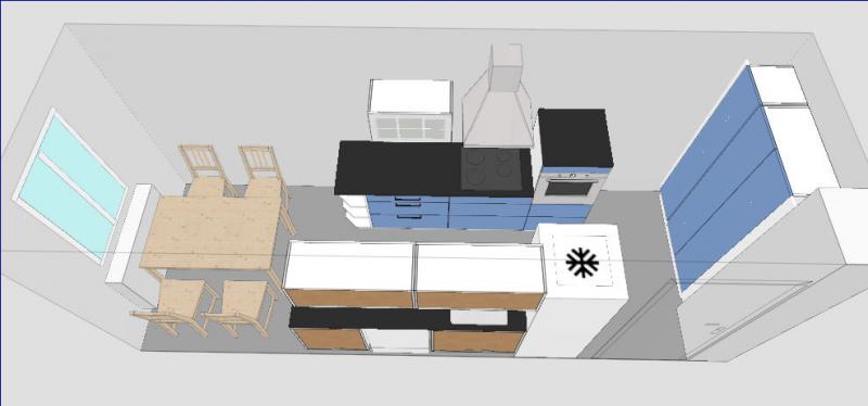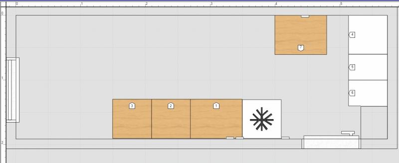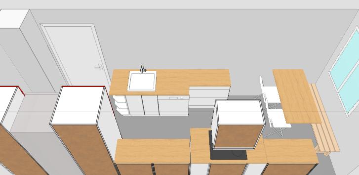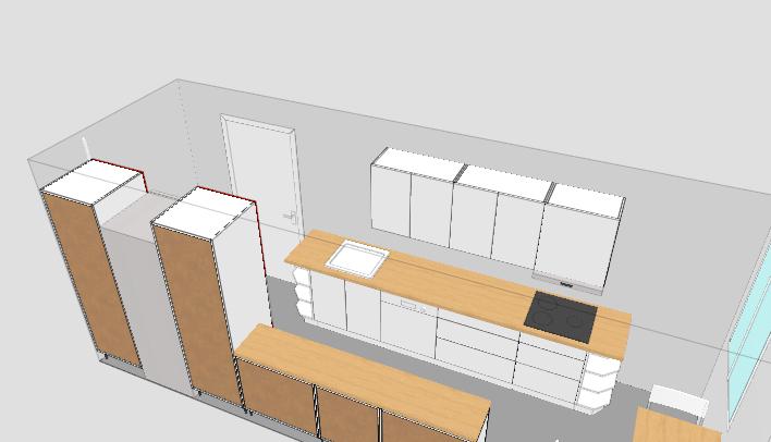 ... so, und jetzt noch eine Variante von mir. Die Tür geht nach außen auf, hast du gesagt. Von daher fände ich es schön, wenn Kühlschrank und Backofen nicht noch wie so Türme im Raum ragen. Ich habe sie also in die Ecke verbannt.