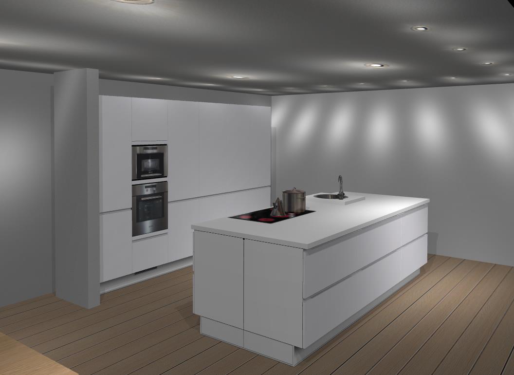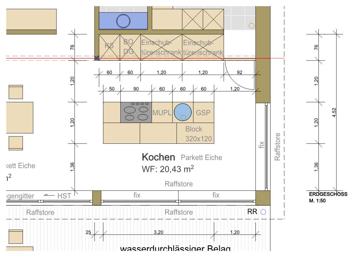 Ich würde mal den GS in die HS-Wand erhöht planen und eine versteckte Gerätegarage einplanen, weil auf der Insel rumstehendes Zeug nicht gerade schön finde..