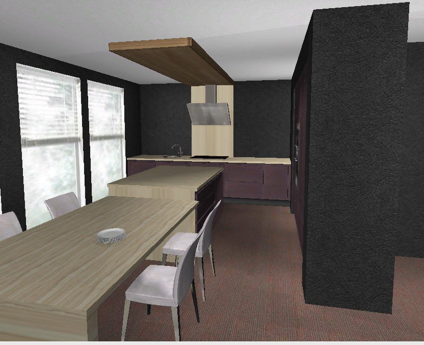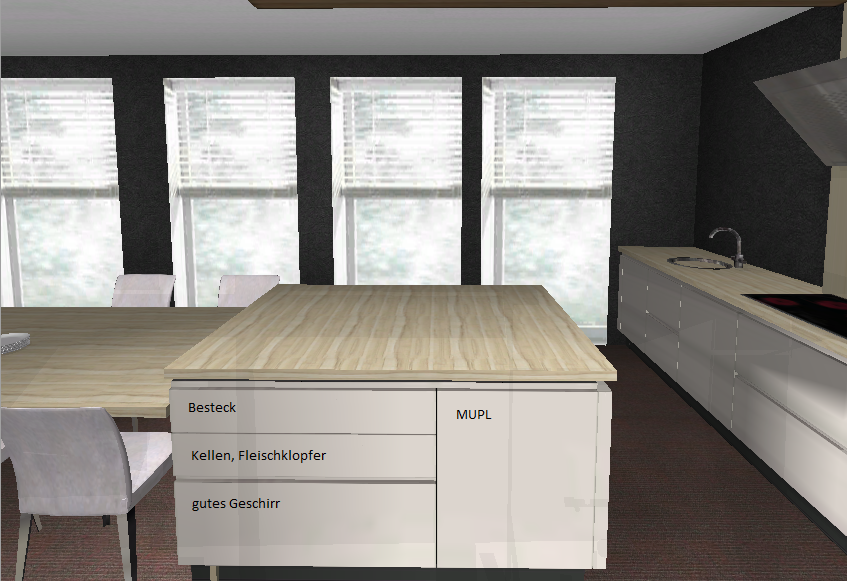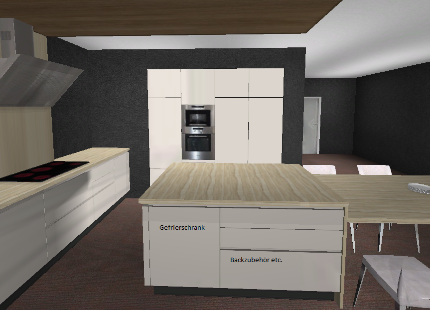 So, ich habe die Schrankgrößen nochmal angepasst und die leichte Unsymmetrie ausgenutzt die durch die Fensterfront entsteht. Das heißt die Insel hat jetzt 1,05m Abstand zur HS Seite und 1,40 zur Fensterseite.