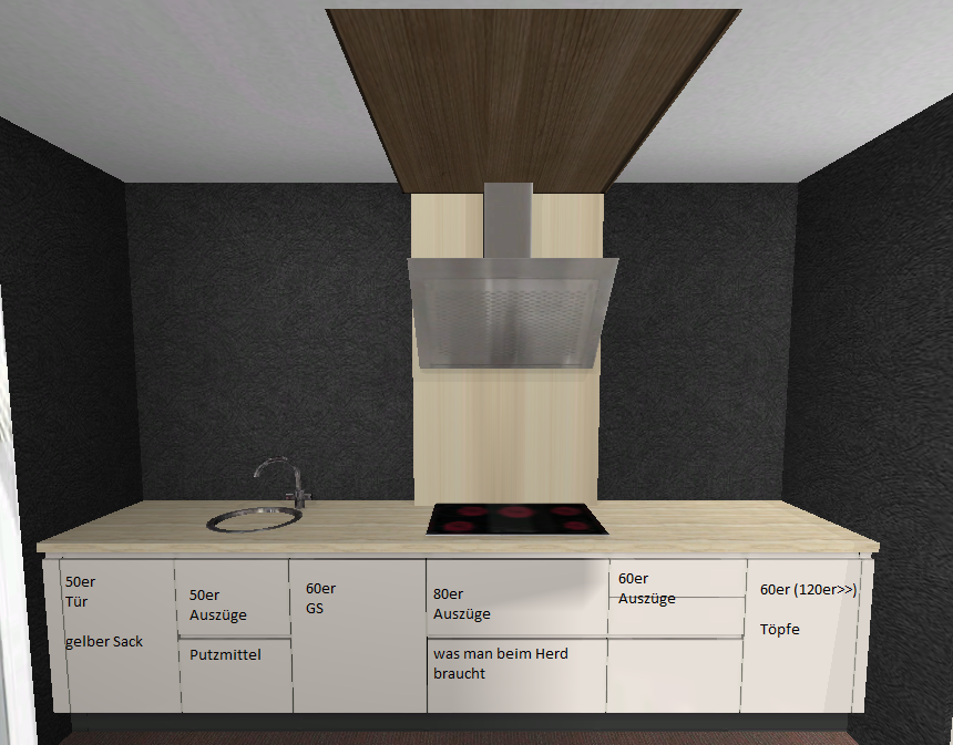 Es gab hier deutlich bessere Vorschläge für die Zeile, inkl. hochgebauten GSP, warum davon abweichen? Auch die HS sind verbesserungswürdig, warum sind die Heißgeräte nicht nebeneinander? Gerde wenn viel gebacken wird