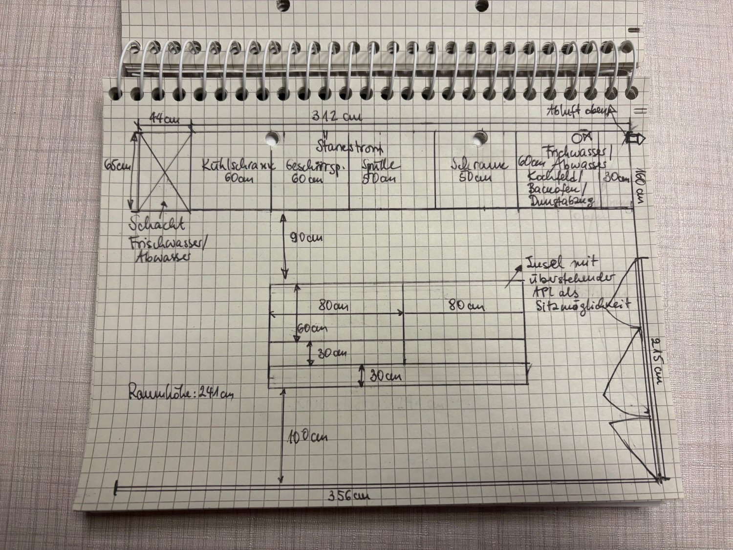 Das größte Problem sind mMn die Anschlüsse, die wir alle an der Wand planoben haben. Wir können Wasser und Starkstrom etwas verlegen, da hab ich kein Problem damit, was wir ungern machen würden ist z.B. den Boden aufzumachen. Unser Ziel ist mehr Arbeitsfläche und mehr Stauraum zu gewinnen. Außerdem wünschen wir uns einen kleinen Essplatz, damit unsere zwei Jungs (5 und 11 Jahre alt) morgens frühstücken können. Unser Essplatz ist separat. Hersteller, Frontfarbe, APL ist für mich momentan erst zweitrangig. Bei den Gesprächen bisher wurden unterschiedliche Formen und Varianten geplant: