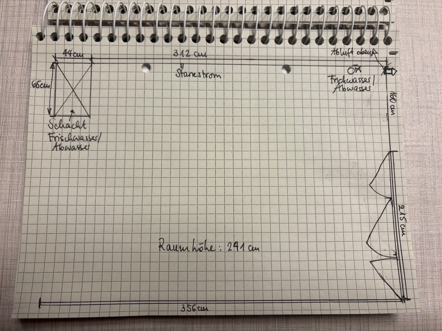 - Über die Feiertage haben wir überlegt die L-Seite doch umzudrehen Richtung Schacht, da machen wir aber den Raum komplett zu und schaffen dann wieder eine tote Ecke. So müsste ich noch die Spülle eher in den Mittelpunkt stellen und das ist nicht der präsentableste Bereich in der Küche...