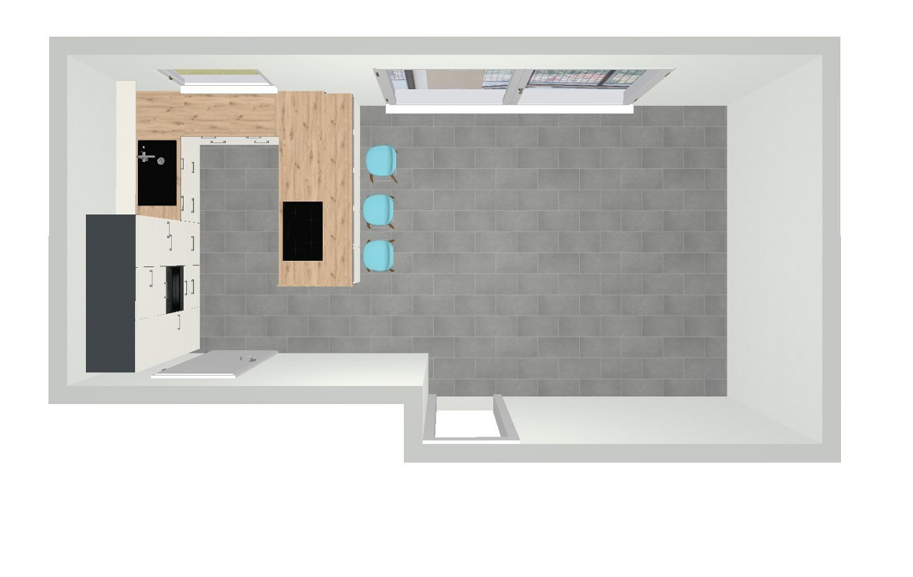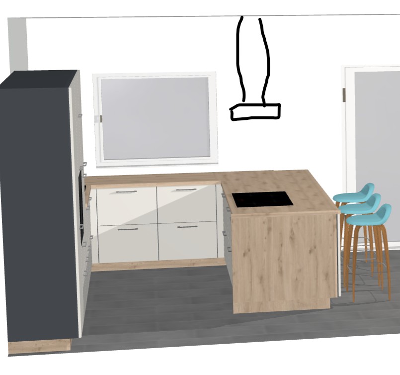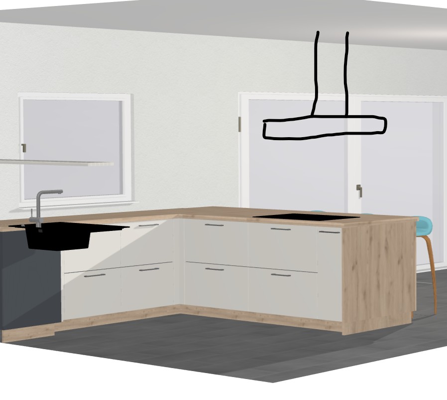 Vor allem die Schrankaufteilung der Insel ist interessant, unterschiedliche Schranktiefen je nach geplanter Nutzung. Statt des Regals könnten bei Dir Sitzplätze sein.