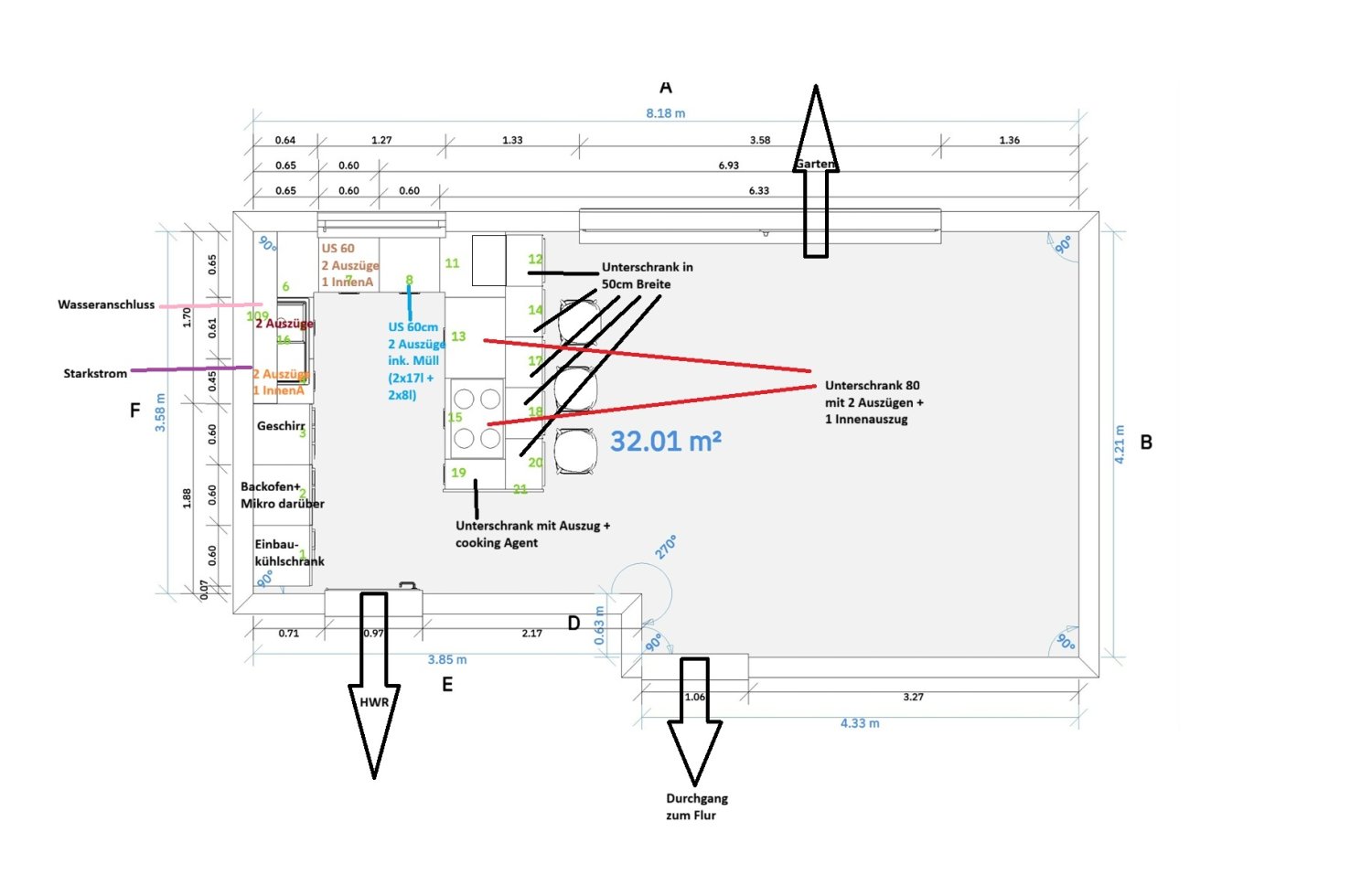 Habt ihr schon mal überlegt, eine Zeile + Halbinsel zu stellen statt der U-Form? Vom Stauraum her wäre es identisch, schränk Nr. 7 könnte dann in der Spülenzeile stehen und Schrank Nr. 8 in der Insel. Ich würde diese Variante bevorzugen, weil man dann nicht so viele Schränke blockiert, wenn man zu zweit (oder noch mehr Personen) in der Küche arbeitet. Sonst blockiert man immer mindestens zwei Schränke wenn man in der Ecke steht. Gerade an den Müll muss man ja häufig, auch wenn jemand kocht und jemand anderes im Esszimmer aufräumt und schnell was wegwerfen will. Daher würde ich den Müll so positionieren, dass man leicht und von mehreren Seiten drankommt. Idealerweise in der Nähe von Spüle, GSP und Hauptarbeitsfläche. 17 Liter für Biomüll finde ich sehr viel. Ich würde 8 l oder weniger bevorzugen und dann lieber etwas öfter leeren. Sonst fängt es ja an zu schimmeln...