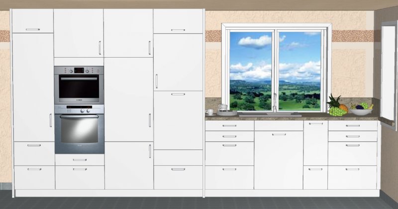 1. Die Spülenzeile mit Hochschränken. Die Linienführung ist noch nicht abschließend!!!