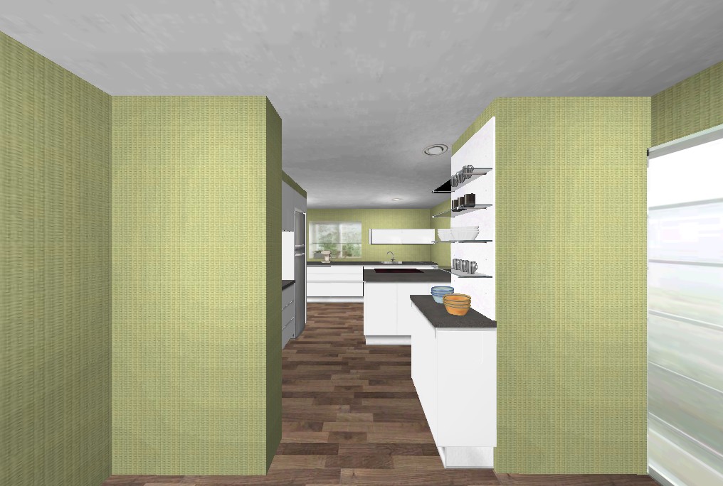 Raumgefühl - die Insel in Verbindung mit dem Durchgang erzeugt einen Labyrinth-Effekt . Es besteht die Sorge, daß der Raum dadurch überladen wird und alle Laufwege komplizierter werden.