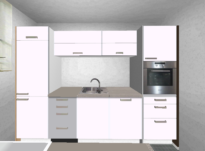 Fürs "stylische" habe ich dir über der Spüle eine Reihe Hängeschränke normal gehängt und das ganze als farblich zusammengefasst. Drüber noch eine Reihe Hochschranktiefe Hängeschränke.
