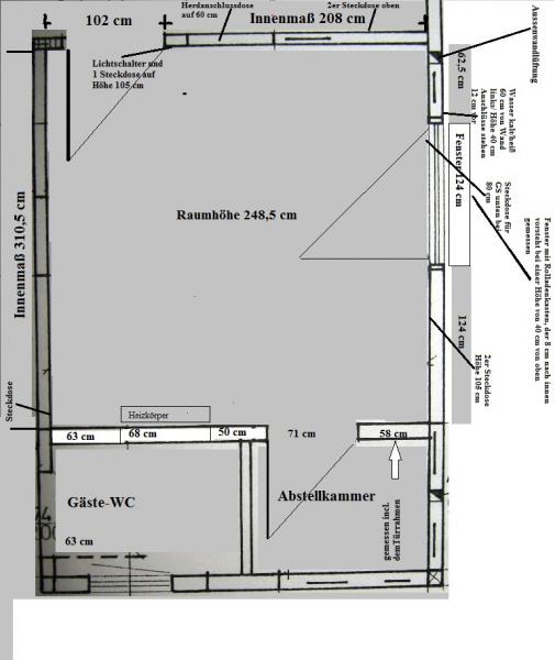 Ich bin für alle Vorschläge offen - vielleicht habt ihr ein paar Tipps für mich, wie ich die Seite mit der Heizung hinbekomme. Notfalls verzichte ich auf einen Tisch, obwohl ich so gerne in der Küche sitze.