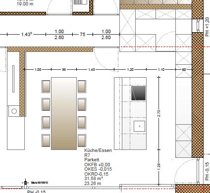 Die Insel ist jedoch aufgrund der Raumtiefe auf max. 3,0m begrenzt. Die derzeit eingezeichnete Insel ist 2,7m damit genügend Platz für den Durchgung Richtung Terrassentüre besteht.