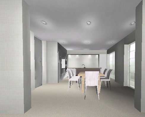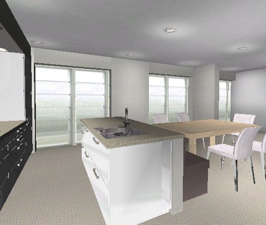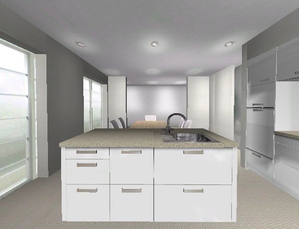 Könntest du dir vorstellen, das Kochfeld an der Wand zu positionieren? Denn im realen Leben ist man mehr mit der Spüle beschäftigt. Du würdest dann nicht soviel "gegen die Wand" arbeiten und hättest das Geschehen im Wohn- und Essbereich im Blickfeld.