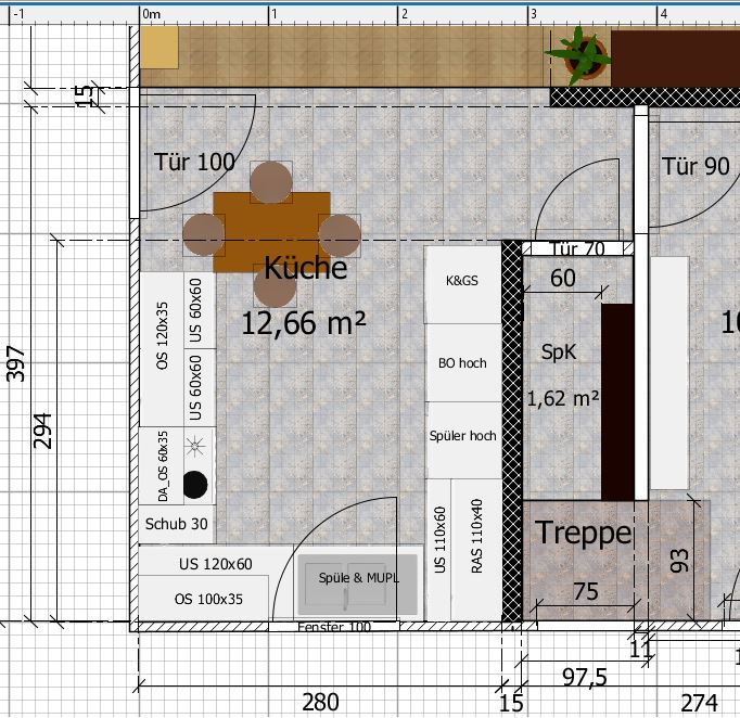 Einen alleinstehenden Küchenblock zwischen Küche und WZ Bereich möchten wir nicht. Kaffeemaschine, Toaster, etc. sollen im Rollladenschrank ihren Platz haben. Die beiden Ecken sollen platztechnisch verfügbar sein - über die jeweils andere (Klapp-)Tür des US. Die Spüle soll auf Höhe des 'ster' des Fensters sein. Abtropffläche ggf. rechts statt links wenn man davor steht. Auf dem Platz zwischen Kochfeld und unterem Oberschrank soll der Thermomix stehen und seinen Dampf ablassen können (ggf. unterstützt von der Dunstabzugsanlage über dem Kochfeld).