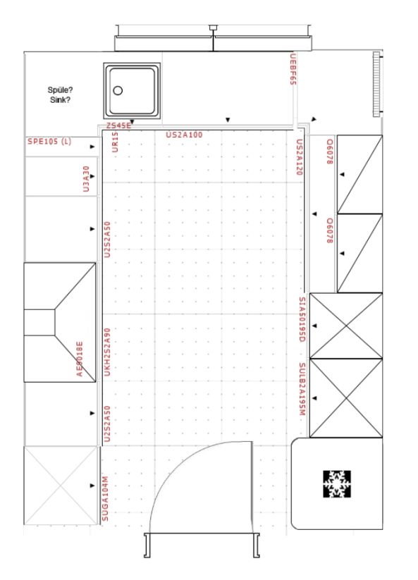 Der Wasser/Abwasser Anschluss liegt im Moment links im Plan bei der Spüle. Der soll entsprechend zu den Geräten verlegt werden. Nur möglich an Fenster und linker Außenwand