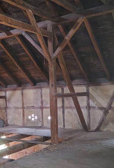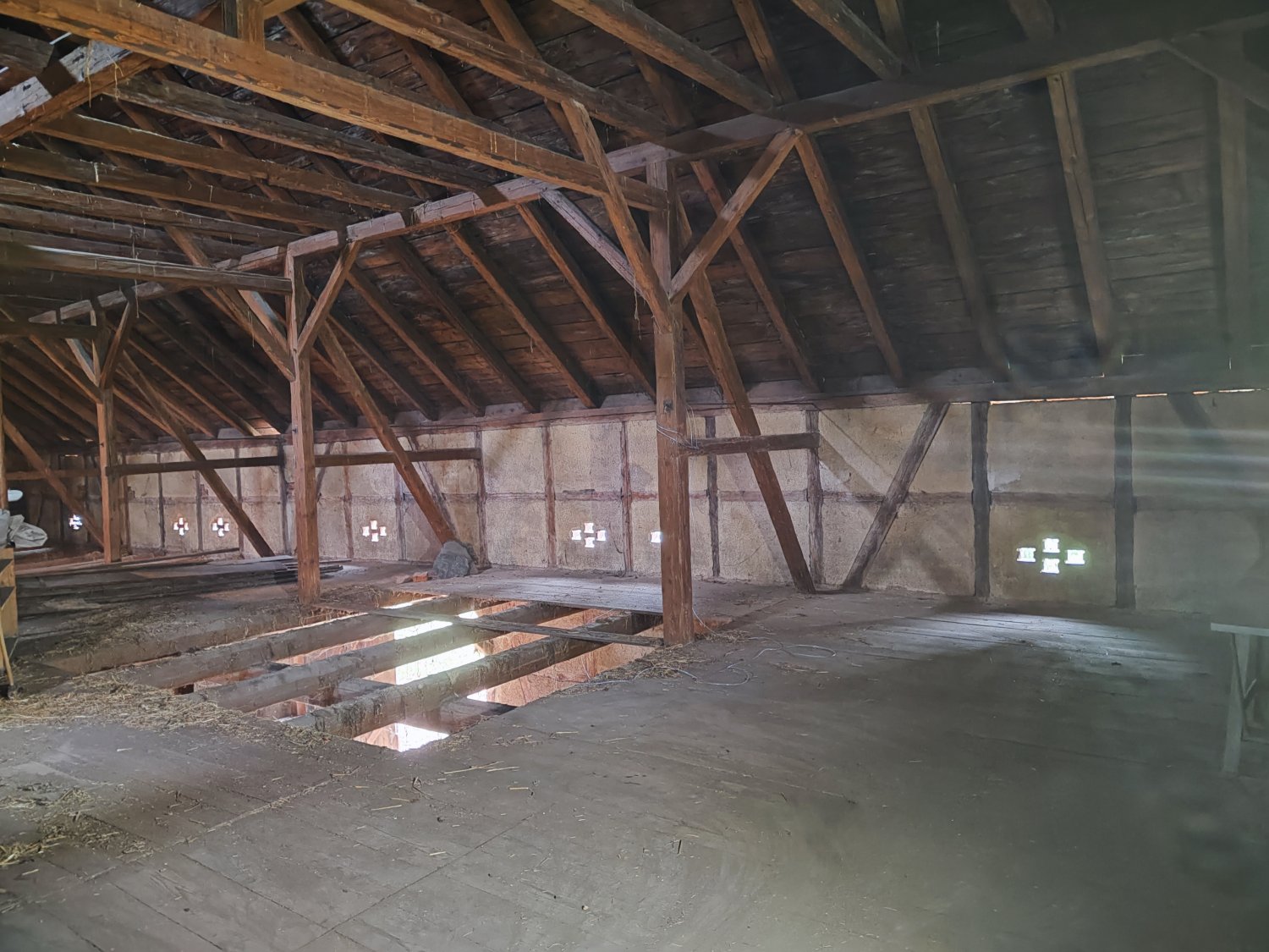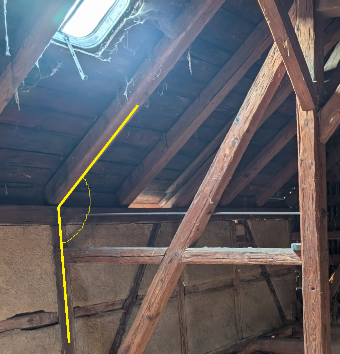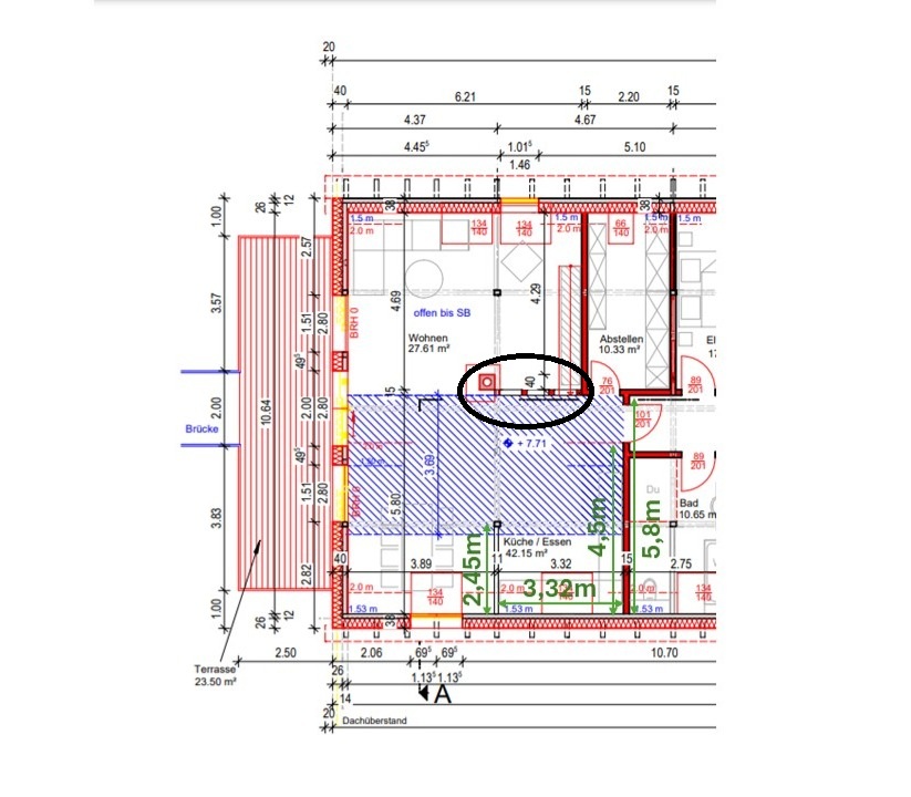 wir (Paar mit Kleinkind und Baby unterwegs) beginnen nun nach langer Planung mit der Sanierung einer alten Scheune. Die Wohnung befindet sich im OG, dadurch gibt es überall Dachschrägen. Der Kniestock beträgt 153cm, nach ca. 55cm ist eine Raumhöhe von 2m erreicht. Es ist ein offener Wohn-Ess-Küchenbereich geplant. Dieser befindet sich an der Giebelseite. Dort wird es große bodentiefe Fenster und eine Balkontür geben. Der Raum ist somit sehr lichtdurchflutet. Die Küche ist auf der Westseite. Ein großes Dachfenster (134x140cm) ist im Bereich der Küche angedacht. Da es sich um eine alte Scheune handelt, sind wir durch die großen Fachwerkbalken bei der Raumaufteilung gebunden. Ein solcher Balken soll auch als Raumtrenner zwischen Küche und Essbereich sichtbar bleiben.
