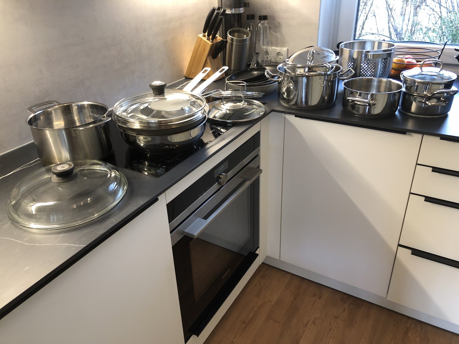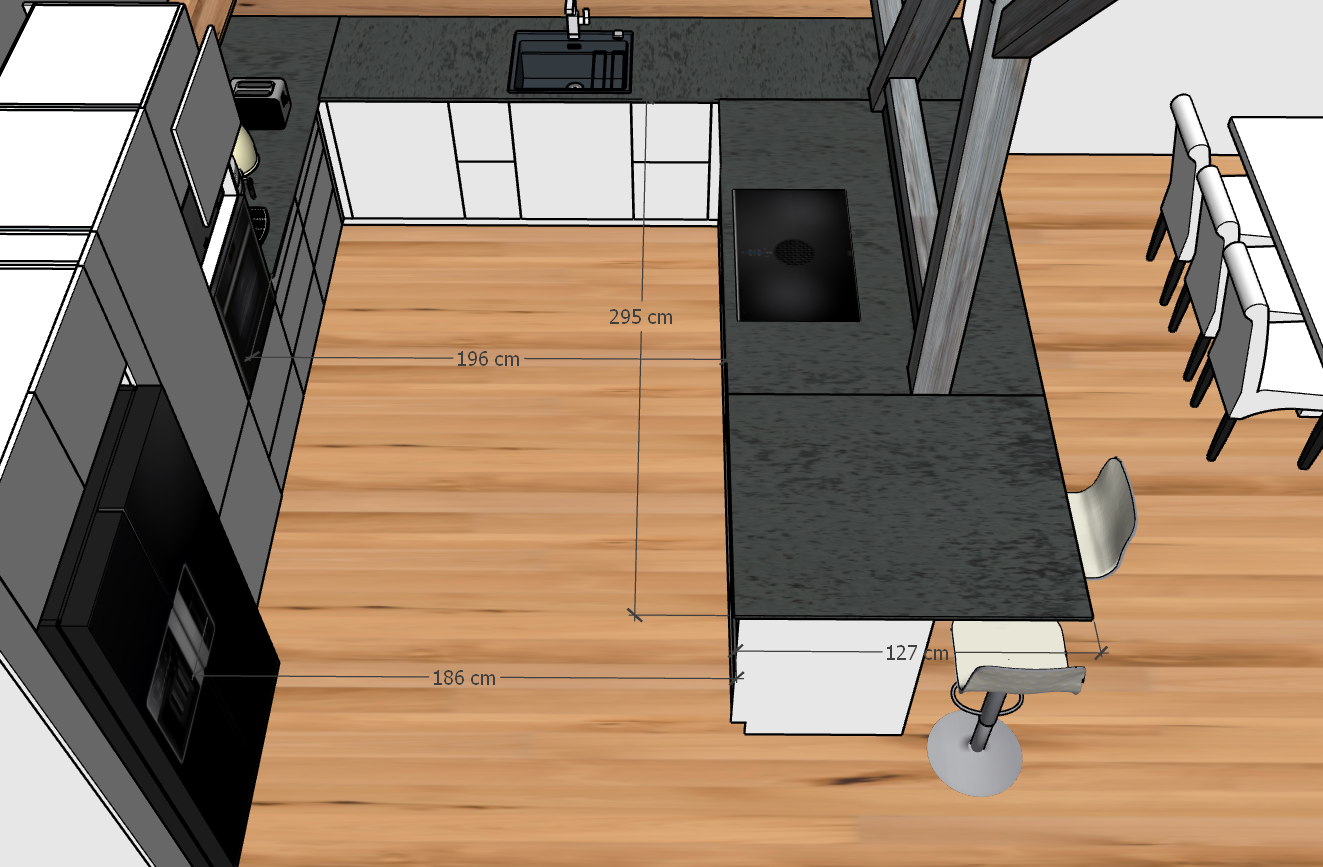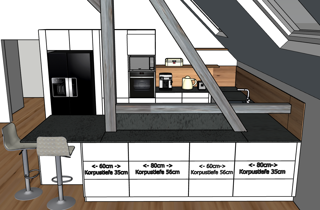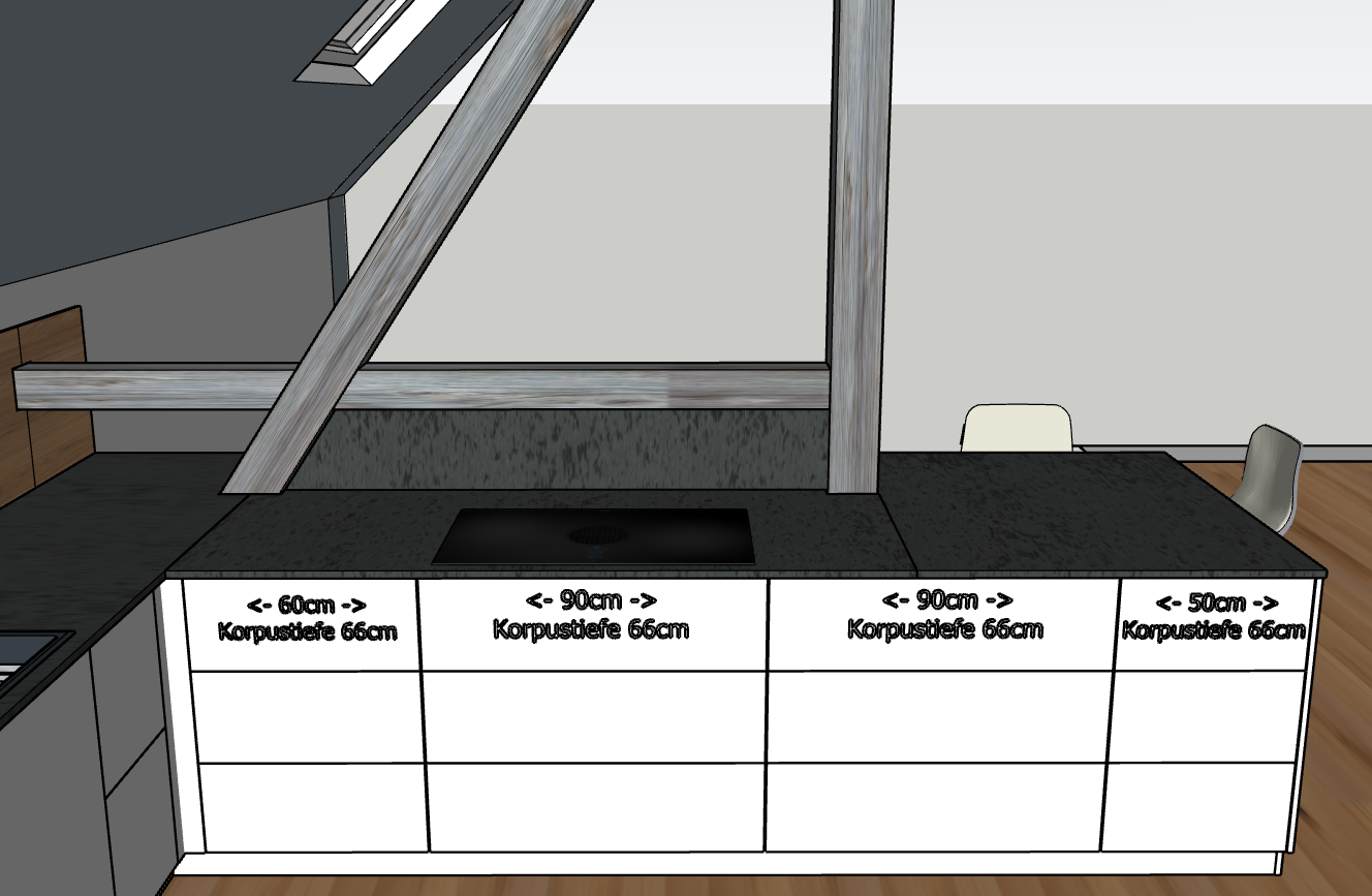 Hab nochmal gezeichnet. Insel innen sind die Schränke (Korpus) 66cm tief und die Schränke an der Fensterzeile ebenfalls 66cm tief.