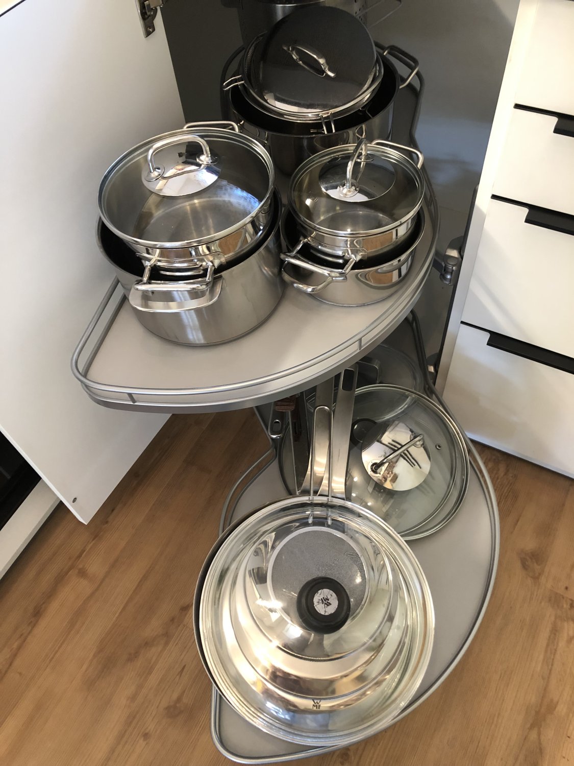 Der Lemans hat nur zwei Auszugsebenen. Ich habe es ausprobiert, alle meine Töpfe in einen 60er Schrank, die oberste Lade blieb frei.