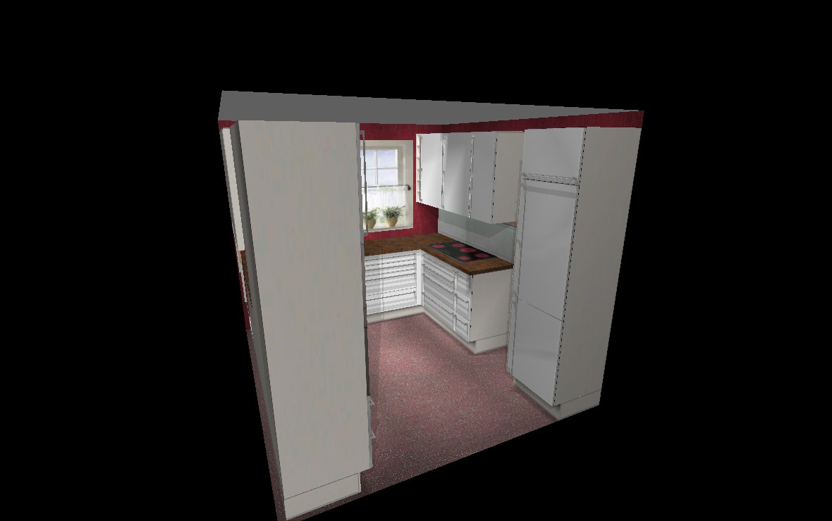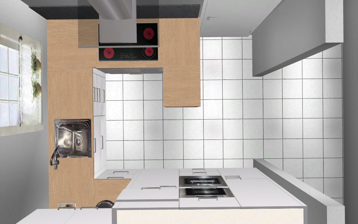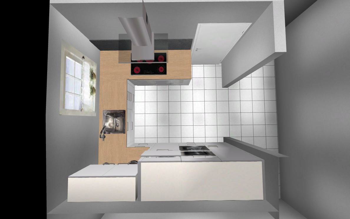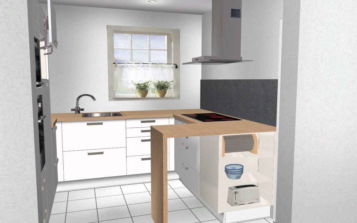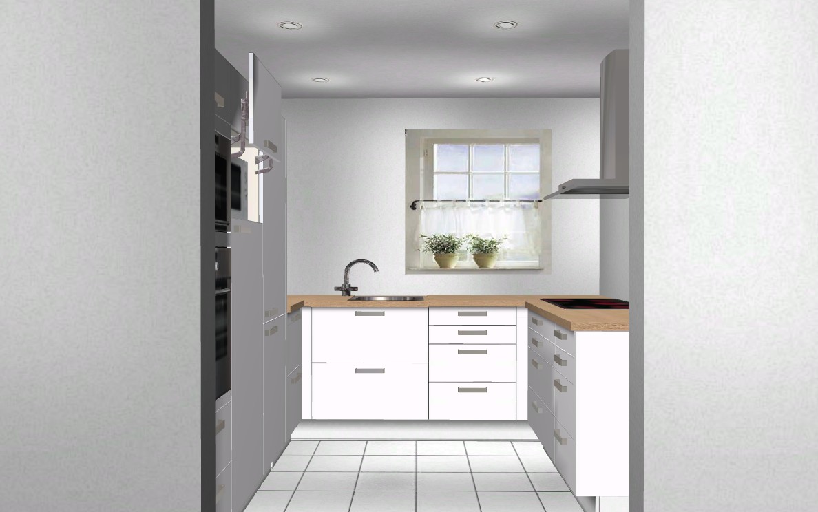 Deshalb schlage ich euch vor doch die Türe im Flur zu schliessen und eine richtige U-Küche in dem Raum zu planen; das sind 2 Schritte mehr, wenn die Flurtüre nicht mehr ist, dafür bekommst Du in der Küche schön viel Arbeitsfläche und die Möglichkeit eine Seite übertief zu gestalten und dann eine schöne grosse Fläche zum Backen und für Teige zu bekommen.