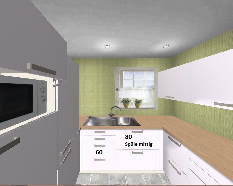 Der 80cm Spülenschrank ist nach planunten gewandert für mehr Platz zwischen Spüle und Kochfeld. Die Spüle ohne Abtropfe rechtsbündig im Spülenschrank, so können auch mal zwei hin (einer füllt die Kaffeemaschine, der andere wäscht gerade einen Apfel ...). Für die paar hangewaschenen Sachen tuts ein Handtuch auf der freien Arbeitsfläche, der Rest wandert in den Geschirrspüler .