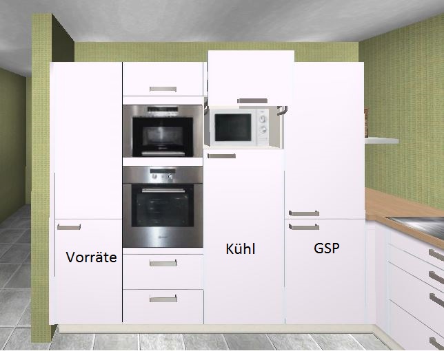 ... den GSP kannst Du in Evelins Planung auch prima hochstellen - darüber wäre dann die Klappe für die Microwelle; dann hast Du den Kühlschrank, plus einen Heissgeräte-HS - der Rest ist mit einem Schrank mit Innenauszügen aufgefüllt - das ist doch perfekt.