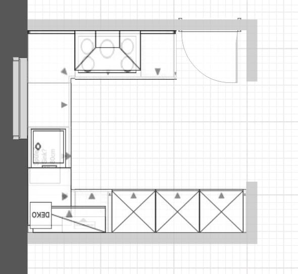 Neben der Eckspüle ist kein Kochfeld sondern unter der Arbeitsplatte nur der Ofen. Ich könnte das leider nicht anders darstellen. Das Kochfeld ist auf der Türseite. Eckspüle ist der Versuch Arbeisplatte am Fenster zu sparen und beim Spülen nicht gegen die Wand gucken zu müssen.