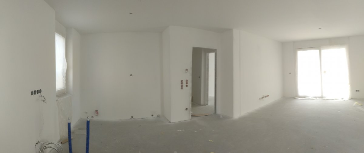 Kaum zu glauben, heute stand ich in meiner zukünftigen Küche... Das Panorma täuscht, der Raum ist nicht riesig (aber hell) und mich haben leichte Zweifel ob des Durchgangs neben der 3 Meter Halbinsel beschlichen (weniger als ich dachte ob des Platzes Esstisch/Insel).
