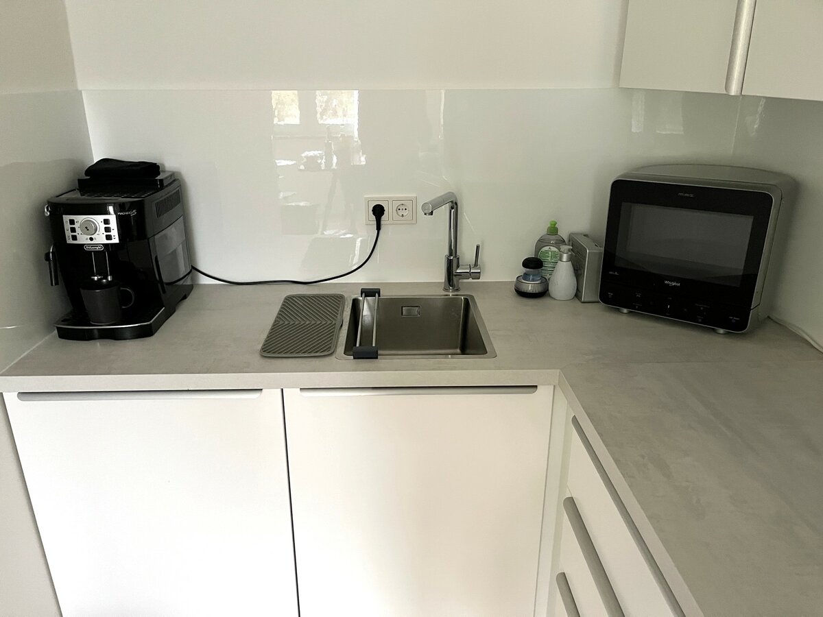 Sehr schöne kleine Küche. Deine Mikrowelle im Eck war lange mein Favorit, da sie hinten abgerundet ist und sich sehr gut in die Ecke schieben lässt. So bleibt vorne deutlich mehr Arbeitsfläche übrig. Wir haben uns am Ende für eine Einbaulösung im Hängeschrank entschieden, das war aber nur möglich, da wir beide sehr groß sind.