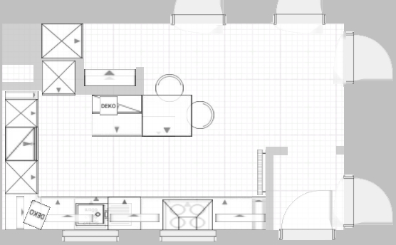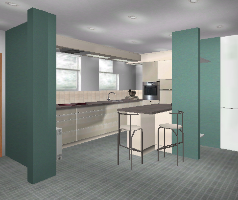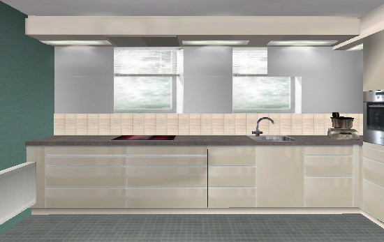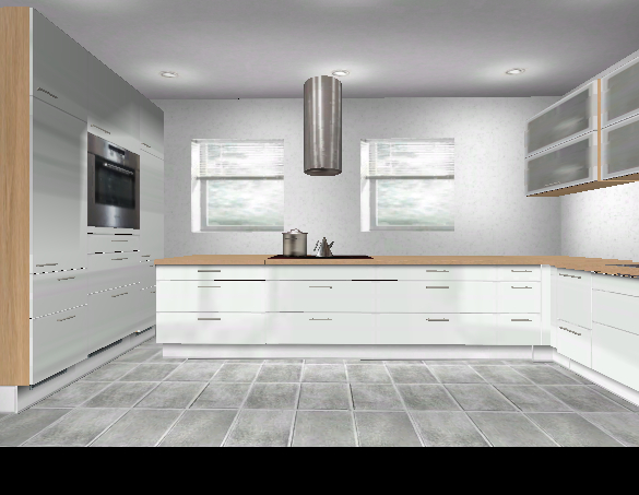 Hmm ... an der Fensterwand ist doch der Heizkörper. Und, wenn mich nicht alles täuscht, hast du geschrieben, dass zwischen den beiden Fenstern nur 67 cm Platz sind. Das ist wohl etwas wenig für Kochfeld / DAH.