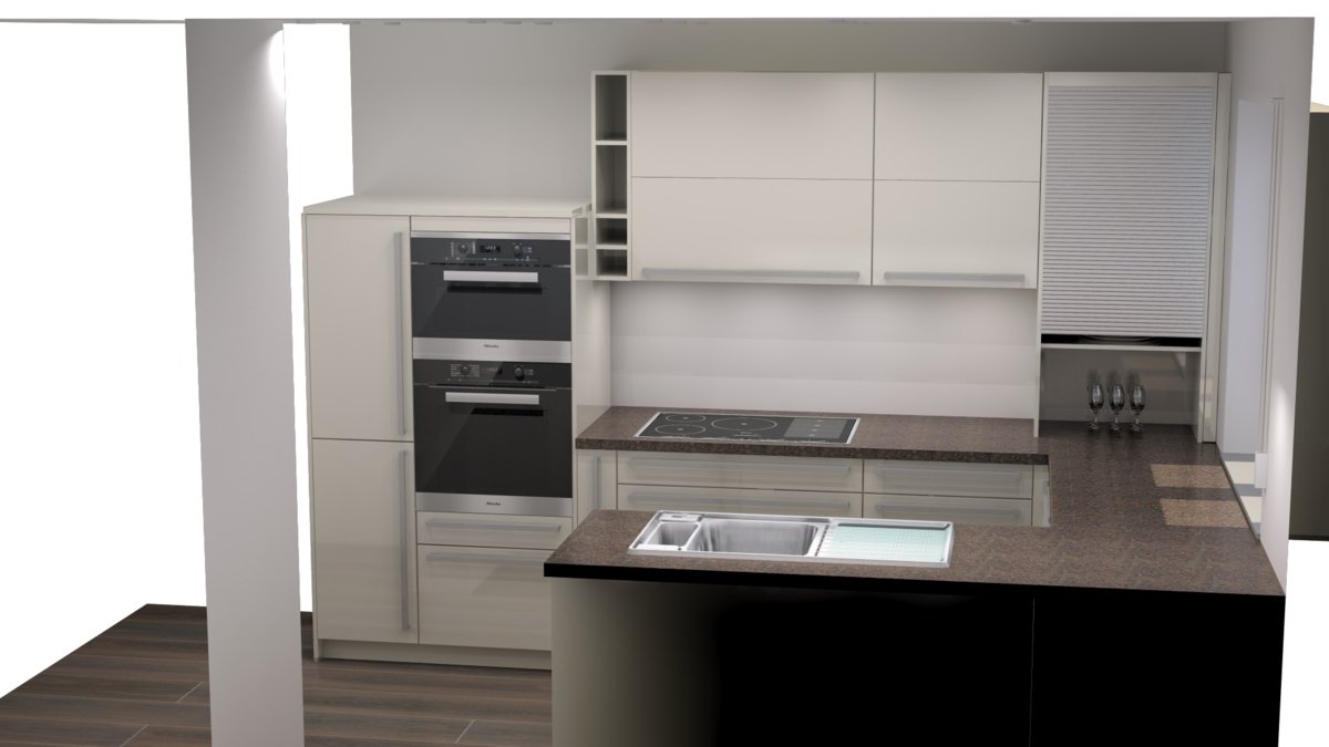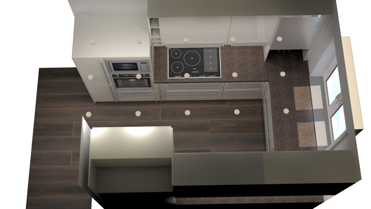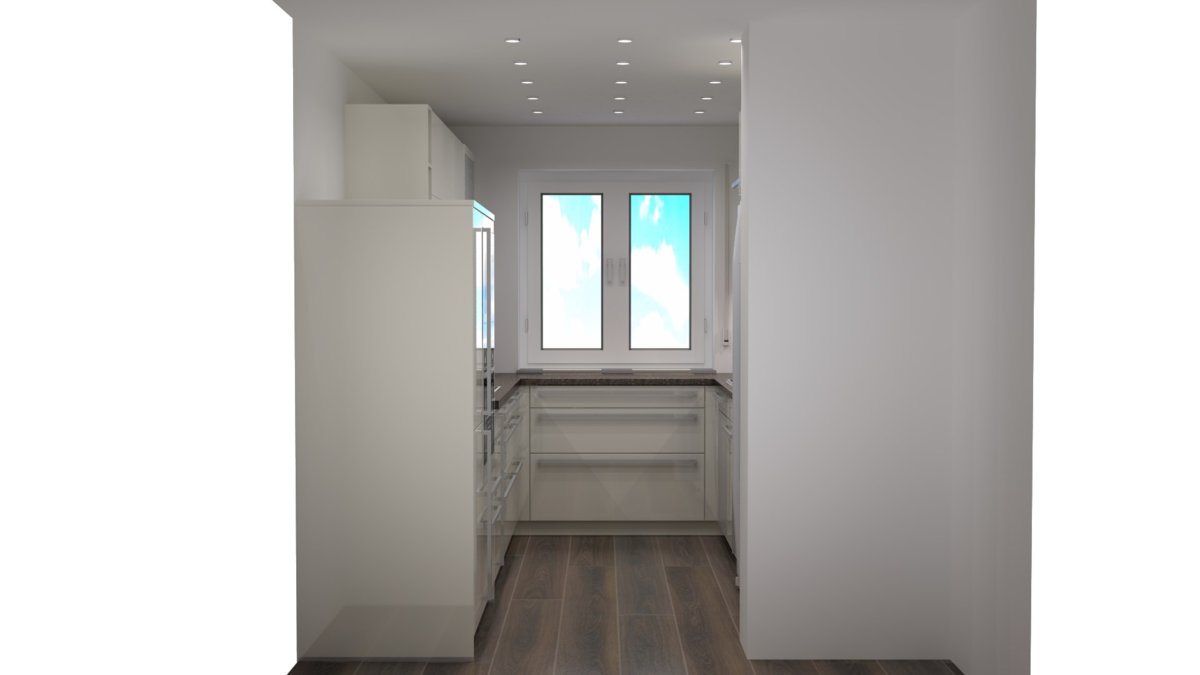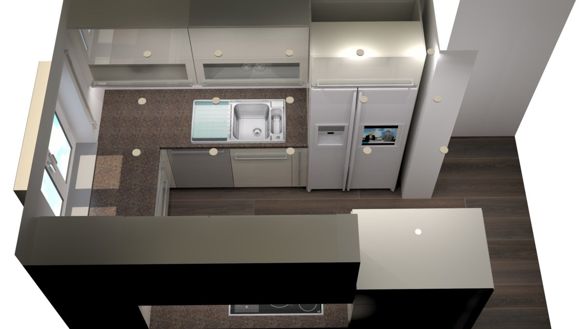 Bei der Lichtplanung könnte es sein, dass die mittlere Spotreihe einen unangenehmen Schattenwurf auf die Arbeitsfläche verursacht, weil wenn man an der Arbeitsfläche steht von hinten beleuchtet wird. Das solltet Ihr nochmal mit Hilfe Euer KFB prüfen.