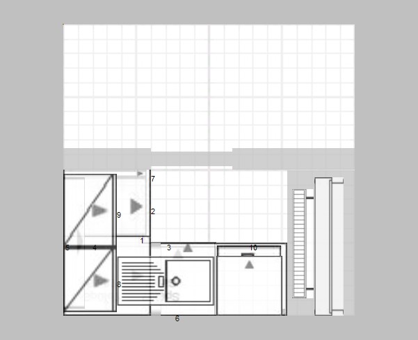 3. die Zeile nur 50cm tief werden, damit man stehen und die Schränke öffnen kann.