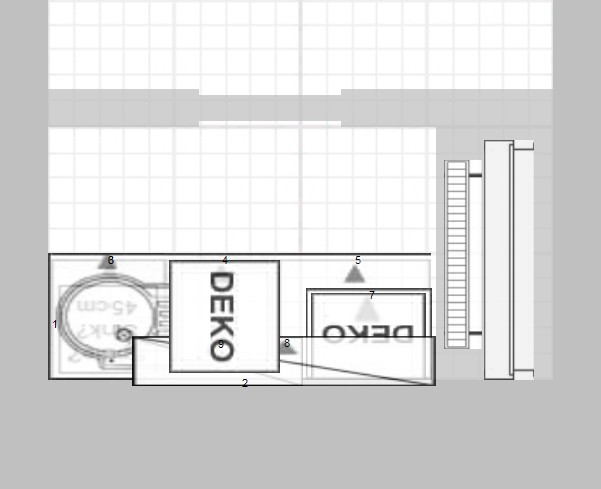 Eine Zeile mit 45cm Spülenschrank, 45cm Lücke für Kühlschrank (mit 45cm Schrank dargestellt), 60cm US. Grill-Mikrowelle auf einem Brett, ansonsten nur 20cm tiefe Borde wegen der Kopffreiheit.