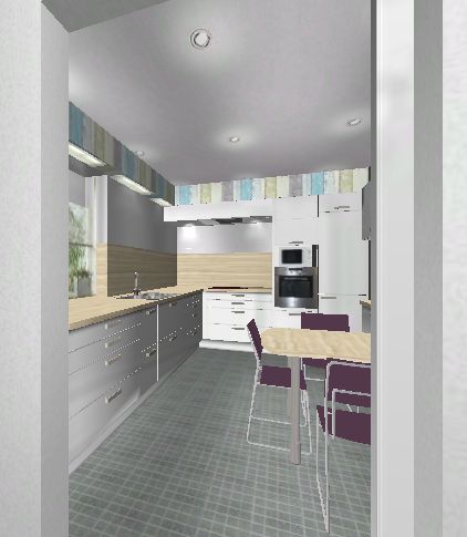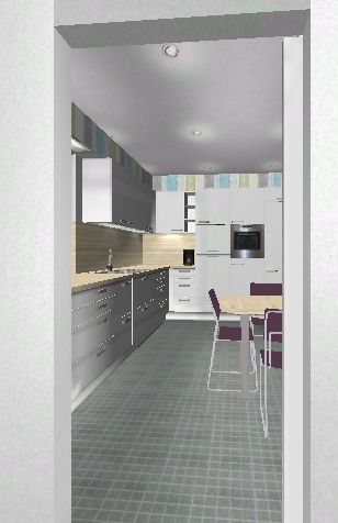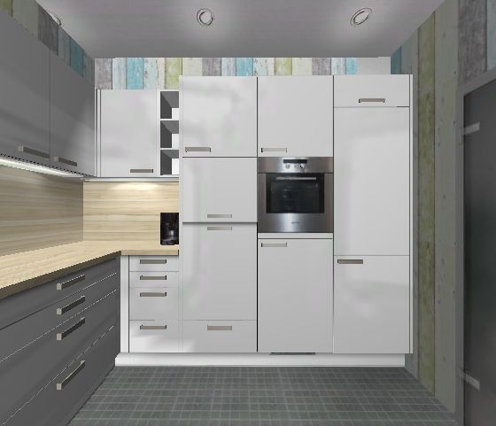 Den Kühlschrank wollten wir nicht direkt hinter der Tür machen. Dort wäre ein nennen wirs Vorratsschrank. Was wir überlegen ist, ob wir den Kühlschrank oder den Backofen in der Hochschrankwand neben den Tisch setzen sollten. Wenn die Tür vom Esszimmer auf ist müsste man an beide drankommen ohne die Tür wieder schließen zu müssen.