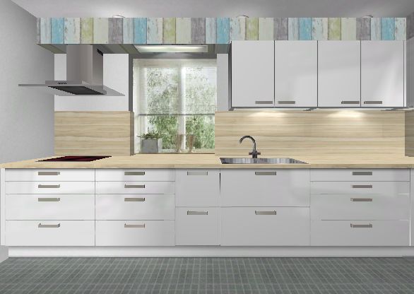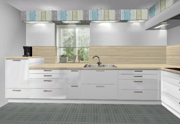 Rundum in ca. 30 cm Tiefe wieder eine Abkofferung um z. B. das Wischen auf den Hängeschränken zu vermeiden ;-) und um Beleuchtung am Fenster zu integrieren.