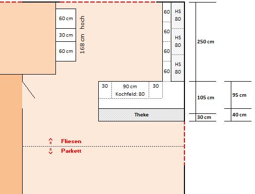 Was stört an der bisherigen Küche und was soll die neue Küche unbedingt können? Warum? : mehr zusammenhängende Arbeistfläche (z.Zt. 150 cm zerstückelt)