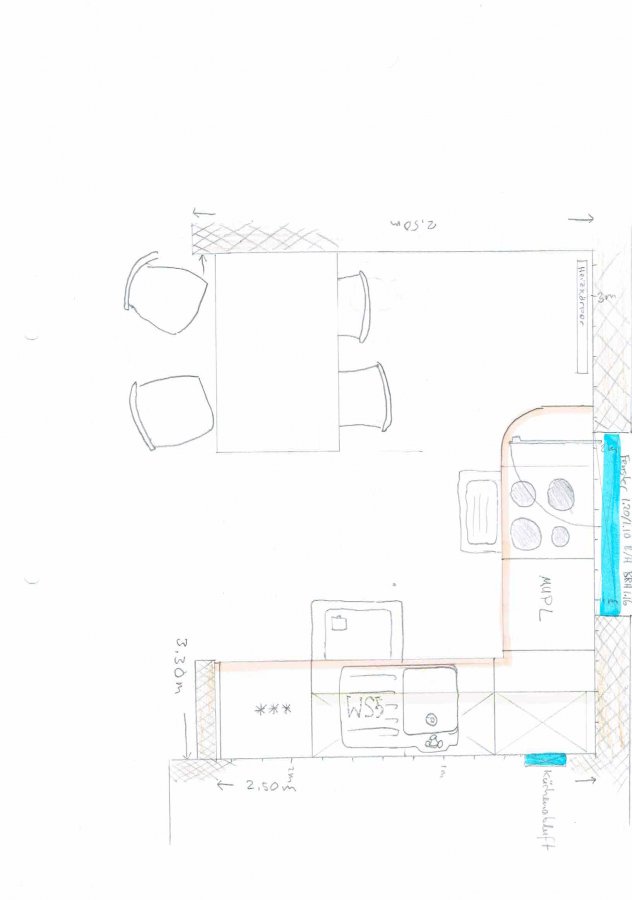 Habe jetzt meine Skizze aktualisiert, also eine volle L-Küche (Arbeitsplatte durchziehen bis zur planlinken Wand). Habe immer noch das Kochfeld ohne DAH am Fenster und die Spüle an der Wand, statt umgekehrt...