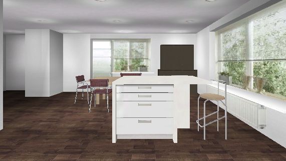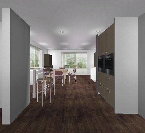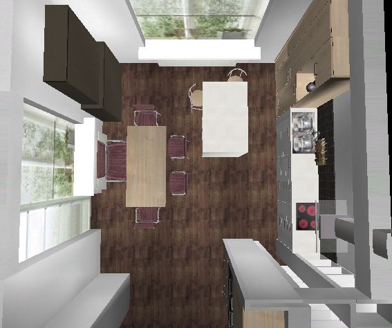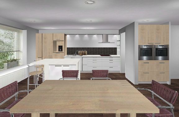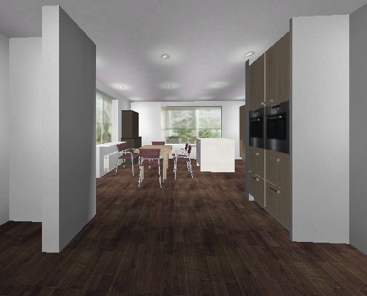 - Einen ganzen Hochschrank (Kühlschrank?) nach planoben rechts ans Fenster, quasi gegenüber dem anderen Block. Da gehen ja die Auszüge und Türen ganz auf, im Gegensatz zu einem GSP. Ein Kühli wäre da zwar bischen weit weg vom Esstisch, aber man kann immernoch links um die Insel laufen, ohne einen Kochenden zu behindern.