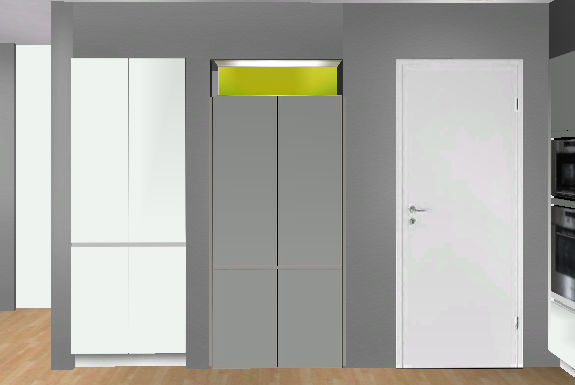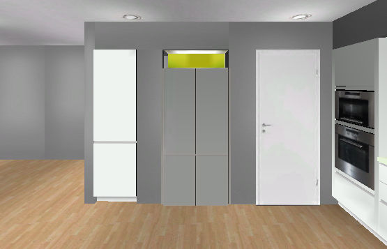 Die lange Zeile jetzt nur noch von 2 Hochschränken umrahmt. Links Backofen und DG (wenn es erstmal kein Dampfgarer wird, dann ein leeres Fach mit Klappe davor). So steht der Schrank zwar mit 5 cm Blende an der Wand, aber links ist die Türlaibung zur Speisekammer, so dass da genug Ellbogenfreiheit sein sollte.