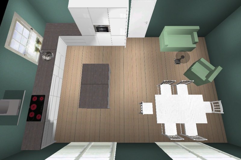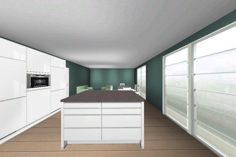 Generell - im Plan noch nicht umgesetzt - würde ich noch überlegen, die Insel relativ schmal zu machen und dafür die Unterschränke an der Wand extratief zu nehmen, da so weitere Stellfläche, die optisch nicht ins Gewicht fällt, also den Raum nicht überläd.