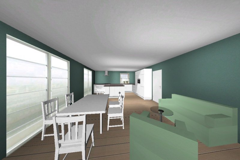 Außerdem hättest du Spüle und Herd mit einer ausreichenden Arbeitsfläche dazwischen in einer Zeile. Da es ein Allraum werden soll, würde ich zu einer Deckenabzugszaube raten.