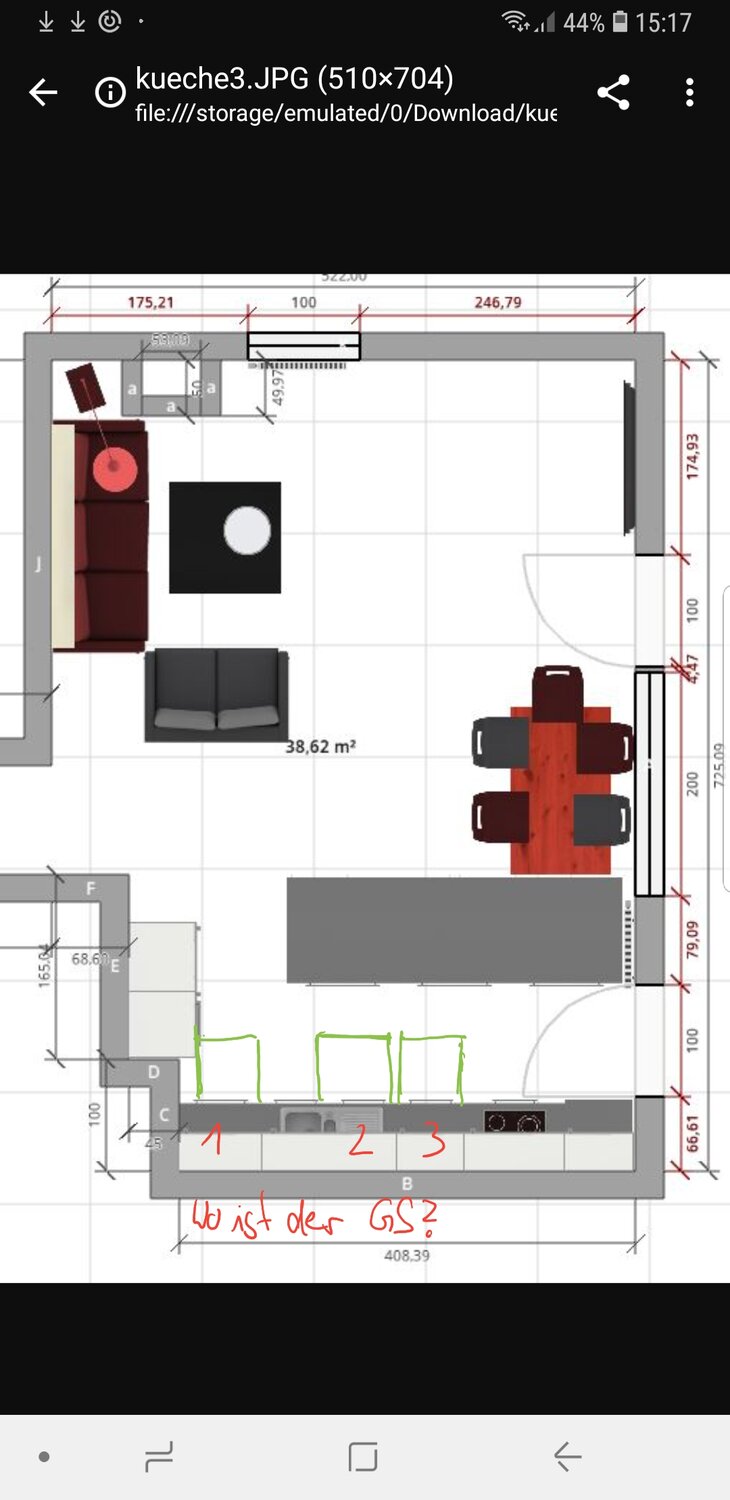 Hallo, ich nehme anhand der Visualisierung an, der GS steht an Position 3, oder? Die offene GS Klappe steht damit sehr ungünstig im Weg. Miss doch mal, wie weit die Klappe deines GS geöffnet vorsteht, bitte. Du wirst die Auszüge gegenüber so nicht ganz aufziehen können.