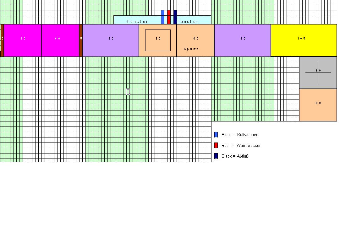 Die Anschlüsse erstrecken sich auf eine Länge von 260 - 280mm ab rechte Ecke. Da müßte also der Spülenunterschrank hin.