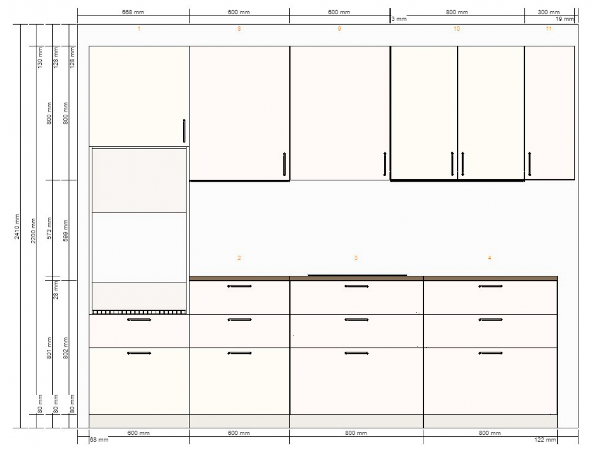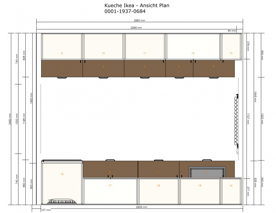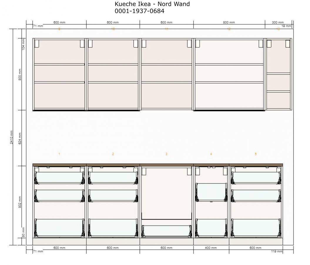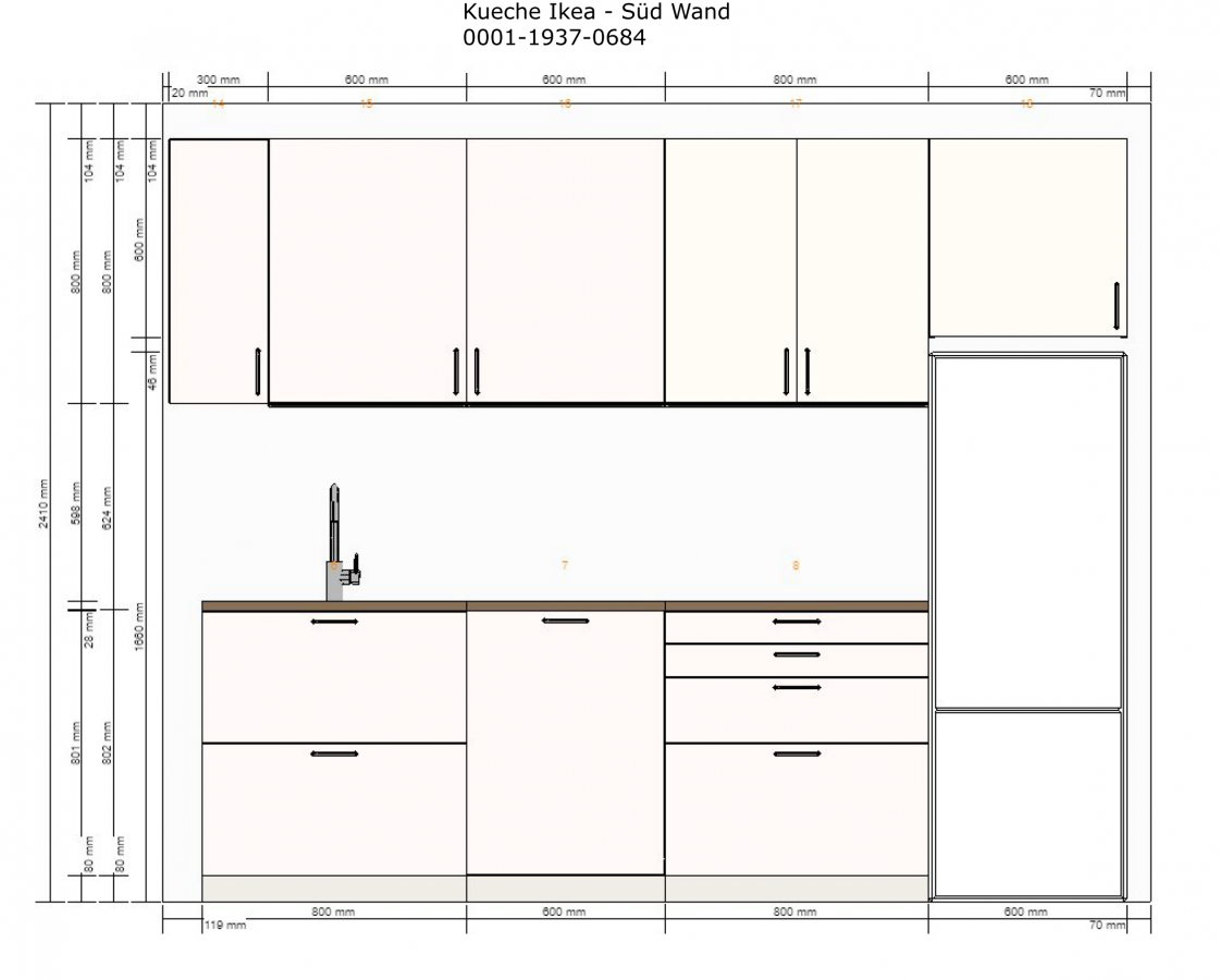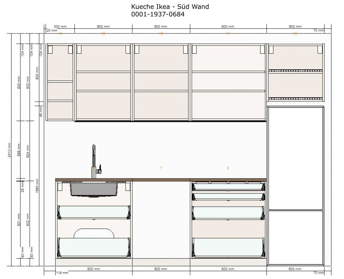 Bei der Groesse der Schubladen bzw. Auszuege bin ich noch unsicher. Ikea hat nur 10, 20 und 40 cm. Ich habe mal bei unserem Geschirr, Toepfen und Kuechengeraeten nachgemessen und kaum etwas gefunden, dass mehr als 18 cm hoch ist. Daher hatte ich urspruenglich mehr 20cm Laden geplant. In den Ausstellungskuechen bei Ikea waren aber unten ueberall 40cm Laden aufgebaut. Daher habe ich das auch mal so eingeplant.