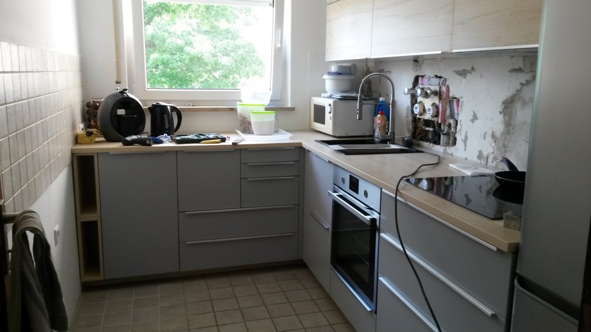 Der Wasser- und Abwassanschluss befindet sich in etwa dort, wo ich die Spuele eingeplant habe (Bild 1 unten rechts, 90cm von der rechten Wand). Die Spuele soll im 80er Schrank nicht mittig, sondern relativ weit zur Seite verschoben eingebaut werden (im Bild 1, nach links). Einerseits kommt sie damit naeher an die Wasseranschluesse, andererseits bleibt somit etwas mehr Abstand zur Wand, um dort noch einen Sodastream abstellen zu koennen. Auf eine separate Abtropfflaeche haben wir verzichtet, damit wir eine groessere, zusammenhaengende Arbeitsflaeche zwischen Spuele und Kuehlschrank haben. Wir gehen davon aus, dass wir die meisten Sachen in der Spuelmaschine reinigen lassen.