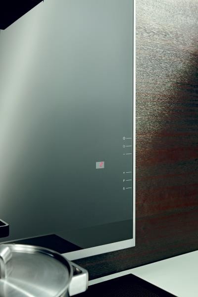 Ihr eleganter Kubus aus hochwertigem Edelstahl, der sich von einem tiefschwarz glänzenden, mit Edelstahl umrahmten, facettierten Glaspaneel abhebt, scheint in ergonomischer Kopffrei-Höhe über dem Kochfeld zu schweben.