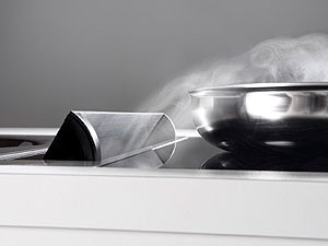 Erst beim Erfassen des Dunstes aus einem Kochtopf wird die Besonderheit der In'to sichtbar. Auf Fingerdruck fährt die Abzugshaube um 12cm nach oben.