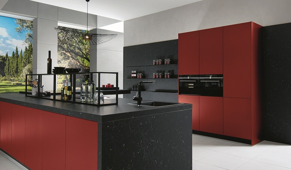 Archaische Kraft: Die Insel in der Raummitte zieht mit ihrer sinnlichen Präsenz wie ein Magnet die Blicke auf sich. Karminroter Mattlack und fast schwarzes Marmordekor sind in ihrer Kombination ein Designstatement, das kreative Spielräume eröffnet. Von asiatischer Ästhetik inspiriert ist das Aufsatzregal.