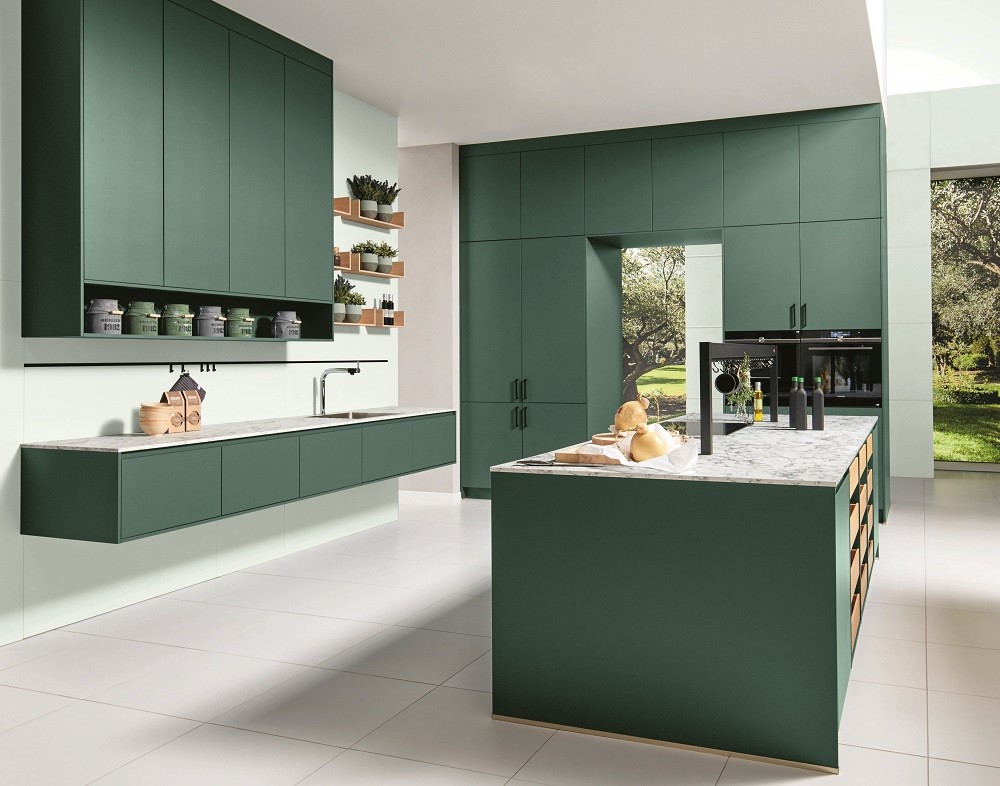 Durchblick erwünscht: Die Grünschattierungen und das Steindekor holen ein Stück Natur ins Haus. Drinnen und draußen, kochen, arbeiten und entspannen – Grenzen werden aufgehoben. Ein Hochschrank wird zum Raumteiler, der zwischen den offenen Strukturen des Wohnens eine Brücke schlägt. Reizvolle Details sind Innenauszüge in Eiche und Ablageregale in Fineline, die warme Akzente im Gesamtensemble setzen.